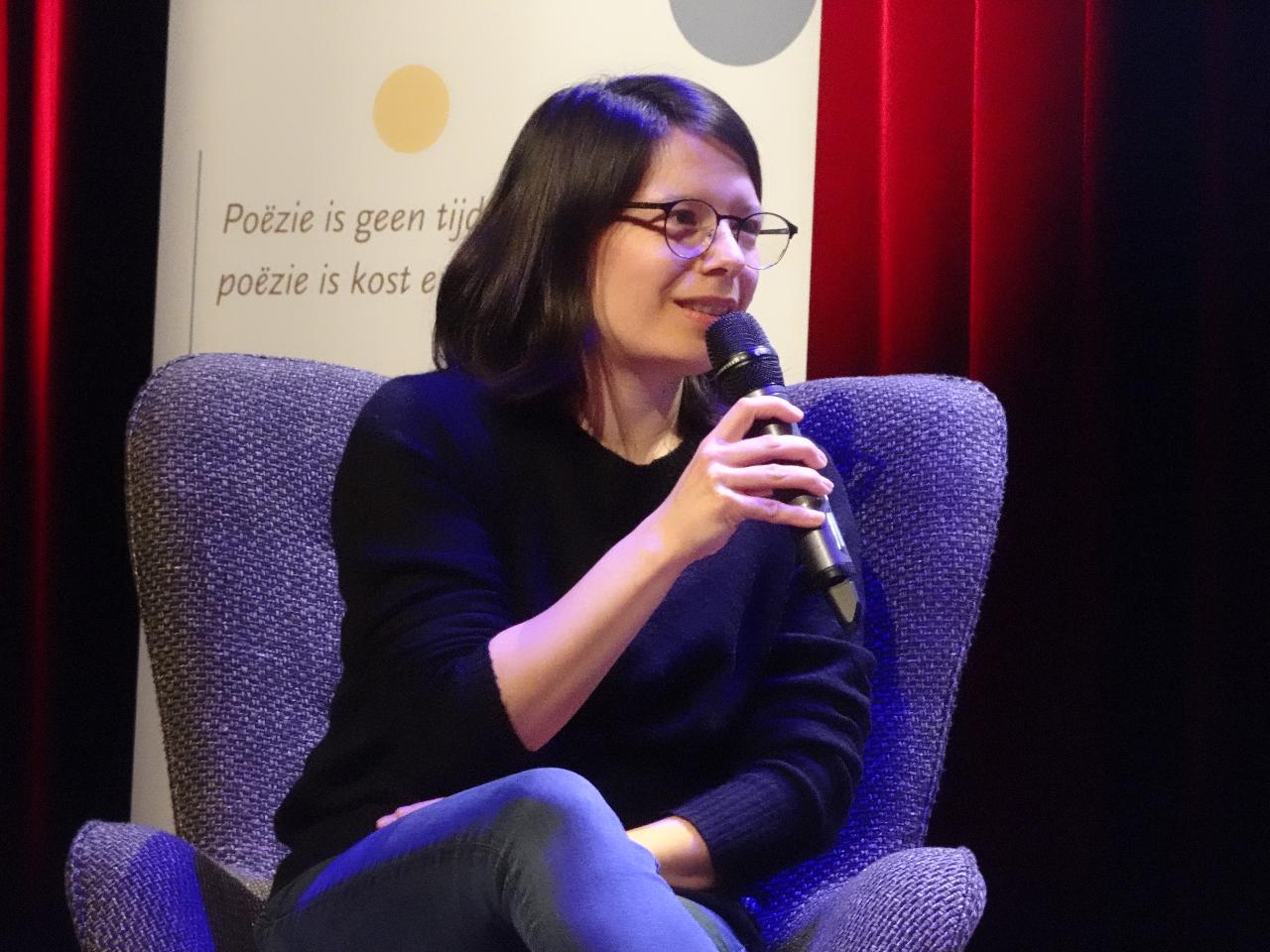Aan de hand van de schetsen lichtte Aimée de Jongh toe hoe ze te werk gaat: ‘Ik werk digitaal, ik doe alles op de computer. Ik werk van schets naar lijn naar kleur.’ Maar eerst maakt ze aantekening tijdens het lezen van de tekst. Kleine schetsjes in de kantlijn van de pagina’s. Om haar eerste associaties en ideeën vast te leggen. Wat in de eindversie van haar verstripping opvalt, is dat het ‘lyrisch ik’ een vrouw geworden is. Of Edward van de Vendel dat oké vindt, wilde Myrte Leffring weten: ‘Ik vind dat juist wel fijn. Het gedicht gaat over grote onderwerpen die niet alleen mij aangaan. Als het goed is, herkent de lezer zich in wat er staat, en eigent zich de tekst toe. En dan gaat het gedicht ook over een vrouw.’ Voor Edward van de Vendel is verstript worden niet de eerste keer dat zijn woorden zich mengen met beeld: ‘Ik werk heel graag met tekenaars. Dat is het voorrecht van boeken maken voor kinderen en jongeren. Ik levert de tekst, en dan zie ik wel wat er komt.’