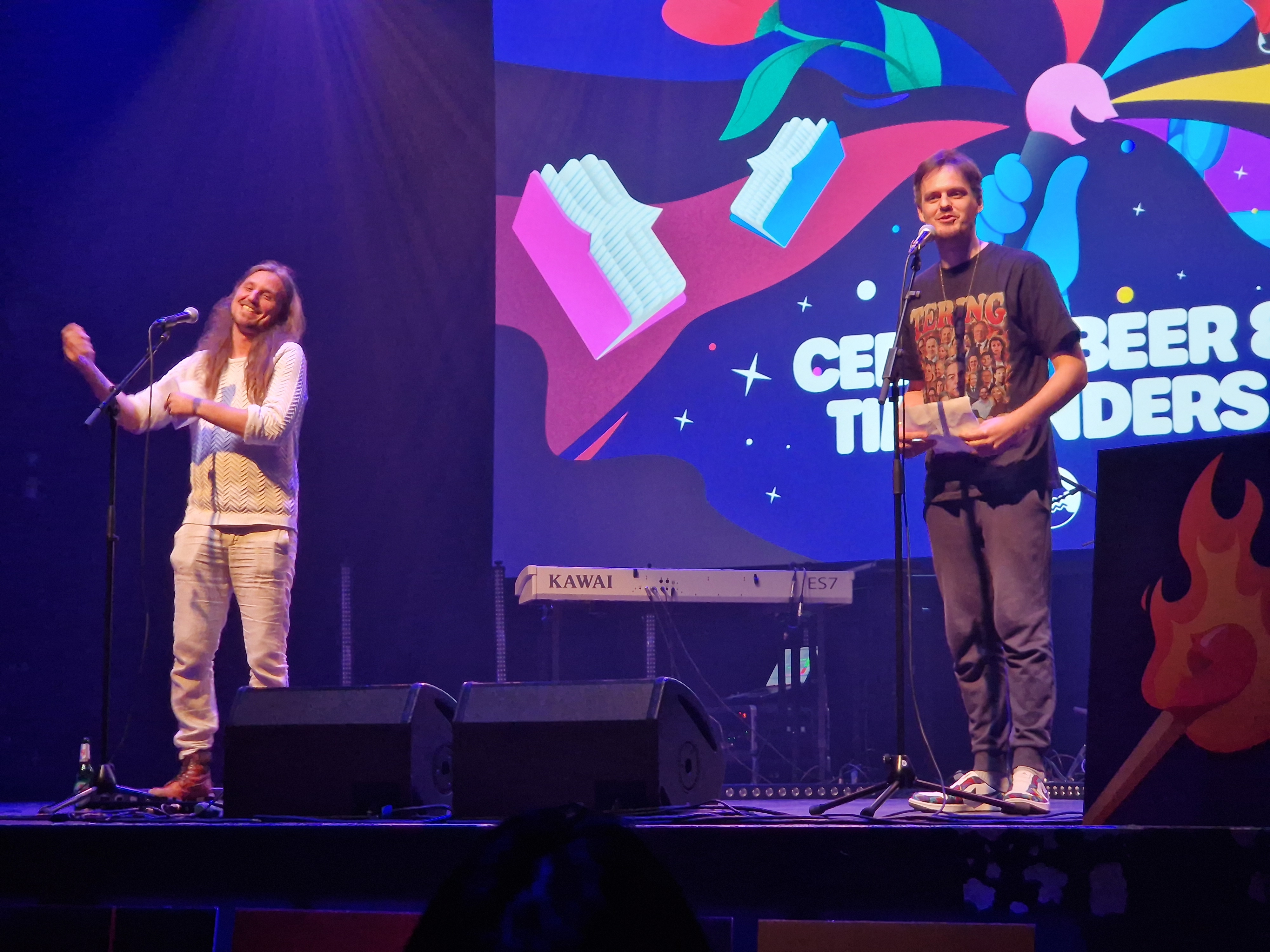 Cees de Boer en Tim Leenders, die destijds Mensen Zeggen Dingen oprichtten, openden de avond met een openhartig inkijkje in het ontstaan van het platform. Hoe succesvol de organisatie nu ook is, het is hen niet komen aanwaaien. Het was een eerlijke voordracht, waarin passie voor woord en taal de boventoon voerde. Al snel werd duidelijk dat het persoonlijke onlosmakelijk verbonden was met de organisatie. Wanneer het persoonlijke leven van Cees vroeg om een stapje terug te doen, deed hij dat ook, uit liefde voor de organisatie en geloof in de potentie. Zo droegen Cees en Tim het stokje na vijf jaar over aan een nieuw bestuur. Dat bestuur bestaat onder andere uit Teddy Tops, Mahat Arab, Thamar Kempees, Maaike Schets en Tessel Rijneveldshoek. In de voordracht van Cees stond het durven loslaten om erop te vertrouwen dat je weer samenkomt centraal, hoe kwetsbaarheid verbindt en dat werken vanuit passie iets ontzettend moois kan opleveren. Een kwetsbaar en kostbaar geluk, zoals hij het noemde.