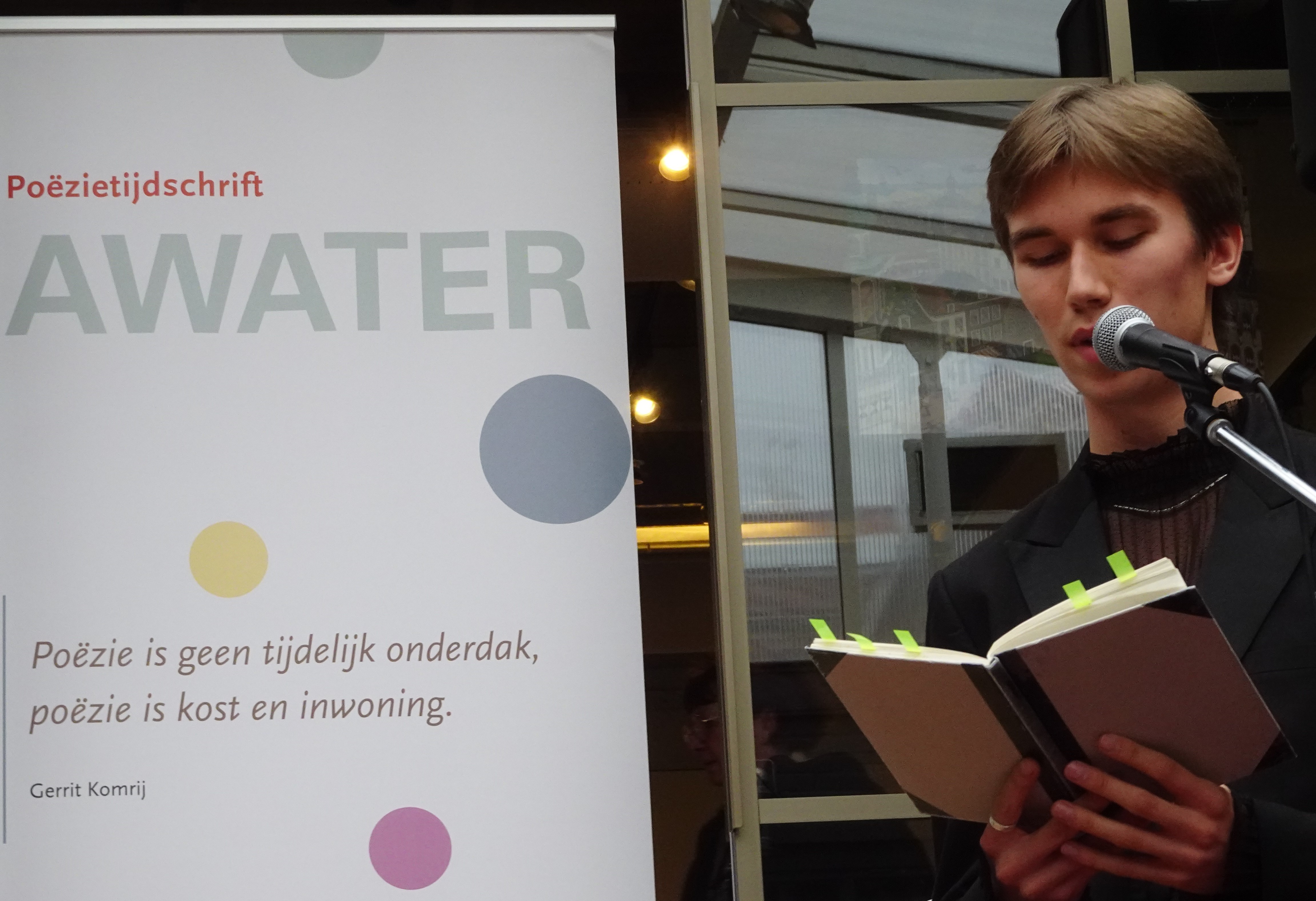 In de overdekte binnentuin van boekhandel De Drvkkerij in Middelburg presenteerde Poëzietijdschrift Awater het winternummer 2025. Te gast waren Micha Braaksma, Anna de Bruyckere en Anne Provoost. De presentatie van de middag was in handen van hoofdredacteur Myrte Leffring en bureauredacteur Alek Dabrowski.