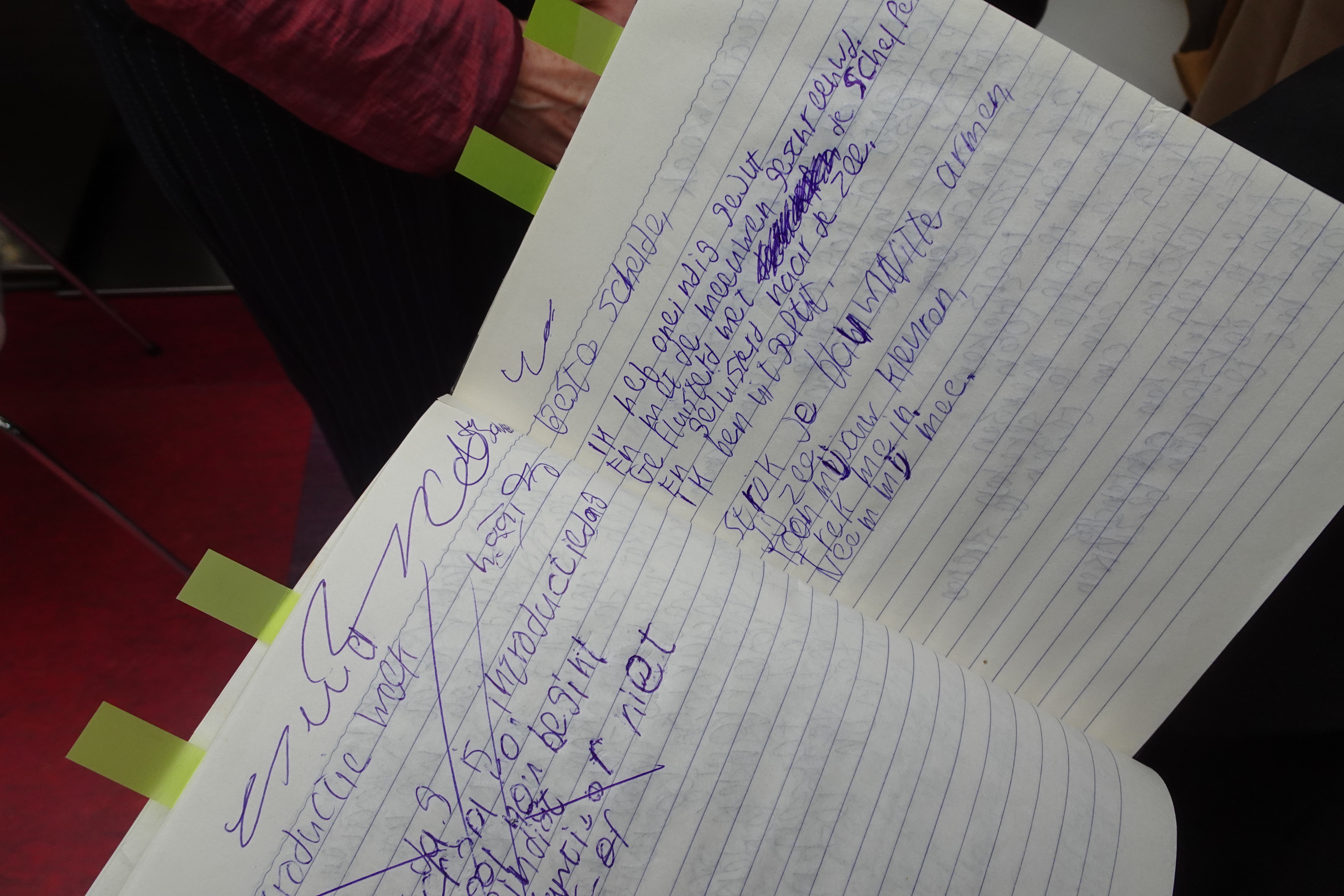 Myrte Leffring: ‘Hoe beïnvloedt poëzie jouw theaterteksten? Anna de Bruyckere: ‘Wat ik regelmatig terugkrijg is dat de taal beeldender is dan mensen verwachten in het theater. Maar de regisseur van het stuk waar ik nu aan werk, zegt regelmatig: “Dit is een dichtregel. Gaan we niet doen!” Dan vindt hij dat ik te veel uitleg. De toneelbeelden niet voor zichzelf laat spreken. Op papier heb je alleen de taal, maar op het podium heb je voldoende extra middelen om dingen onbenoemd te laten.’